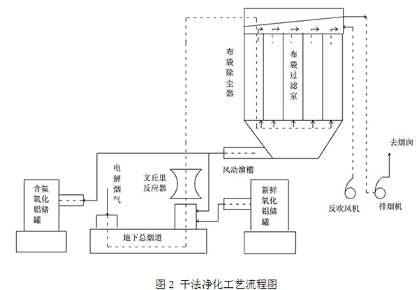 干法凈化工藝流程包括電解槽集氣、吸附反應(yīng)、氣固分離、氧化鋁輸送、機(jī)械排風(fēng)等五個(gè)部分,如圖2所示。