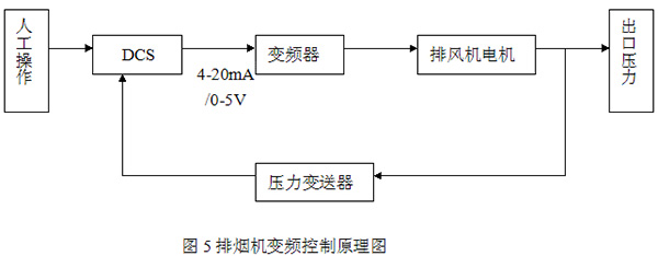 如圖5所示,檢測排煙風(fēng)機(jī)出口煙氣壓力,因?yàn)楫?dāng)內(nèi)外壓差太大時(shí),布袋除塵器中的煙氣沒有被除掉,就被直接吸出,影響凈化效果。為了保證煙氣凈化過程順暢進(jìn)行,DCS接受壓力變送器傳輸過來的壓力信號(hào),按照既定算法進(jìn)行計(jì)算。當(dāng)壓力超過系統(tǒng)設(shè)定值時(shí),DCS發(fā)出4-20mA或0-5V的信號(hào)來降低變頻器的頻率,實(shí)現(xiàn)排風(fēng)機(jī)降速運(yùn)行來降低出口煙氣壓力;當(dāng)壓力低于系統(tǒng)設(shè)定值時(shí),DCS發(fā)出4-20mA或0-5V的信號(hào)來升高變頻器的頻率,實(shí)現(xiàn)排風(fēng)機(jī)升速運(yùn)行來升高出口煙氣壓力。