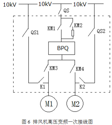 r/min。本系統(tǒng)選用四臺(tái)山東新風(fēng)光電子科技發(fā)展有限公司生產(chǎn)的JD-BP38-560F型高壓變頻器,采用一拖二方案。如圖6所示