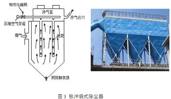 (2)脈沖袋式除塵器,如圖3所示,含塵氣體從袋式除塵器進(jìn)口引入后,通過煙氣分配裝置均勻進(jìn)入濾袋,在此過程中粉塵即被濾袋的外側(cè)所阻擋,經(jīng)過凈化處理的氣體從出口排出,當(dāng)濾袋表面的粉塵不斷增加到一定的厚度,導(dǎo)致設(shè)備阻力上升到設(shè)定值時(shí),微壓差控制信號(hào)有信號(hào)輸出。控制儀發(fā)出信號(hào),使噴吹系統(tǒng)工作,電磁脈沖閥打開,此時(shí)壓縮空氣從氣包順序經(jīng)脈沖閥和噴嘴向?yàn)V袋內(nèi)噴射,附于袋外的粉塵脫離濾袋落入灰斗,然后由回轉(zhuǎn)排灰閥將粉塵排出。