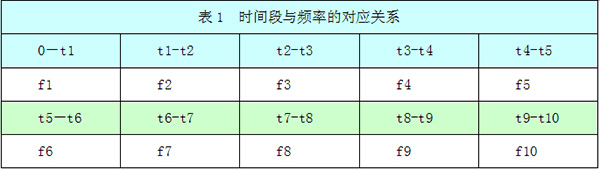 變頻器運(yùn)行中根據(jù)實(shí)際運(yùn)行時(shí)間自動(dòng)選擇應(yīng)該運(yùn)行的時(shí)間段,然后將運(yùn)行頻率調(diào)整至該時(shí)間段對(duì)應(yīng)的頻率,時(shí)間段與頻率的對(duì)應(yīng)關(guān)系如表1示: