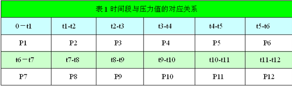 變頻器人機界面在運行中根據(jù)實際運行時間自動按照設(shè)置好的壓力值賦值到主控,然后變頻器主控將運行頻率調(diào)整至該壓力值對應(yīng)的頻率,時間段與壓力值的對應(yīng)關(guān)系如表1所示。