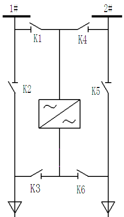 吉林某水務(wù)集團結(jié)合該自身的實際情況,為滿足泵站的安全運行需求,要求水泵電機一用一備設(shè)置,因此選擇了新風(fēng)光JD-BP38系列高壓變頻調(diào)速系統(tǒng)中一拖二手動運行的主回路,主回路圖如圖3所示。其中K1刀閘與K4刀閘互鎖,保證兩路高壓電源不會同時作用于變頻回路;K2刀閘與K3刀閘互鎖,保證工頻電源與變頻電源不會同時作用于電機M1;K5刀閘與K6刀閘互鎖,保證工頻電源與變頻電源不會同時作用于電機M2.