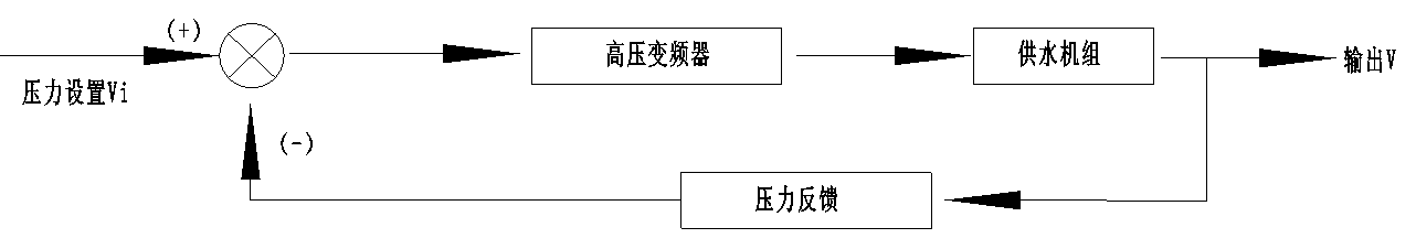 為滿足不同時段不同地區(qū)的用水壓力需求,該水廠采用先進的恒壓供水控制系統(tǒng),可以對水廠出口處的水壓值V進行精確的處理和控制,并與壓力設(shè)置值Vi構(gòu)成閉環(huán)控制系統(tǒng)。恒壓供水系統(tǒng)原理如圖2所示。變頻器內(nèi)部的主控DSP采集供水壓力值V與用戶給定值Vi進行比較和運算,通過PID進行調(diào)整,將結(jié)果轉(zhuǎn)換為頻率調(diào)節(jié)信號送至變頻器,直至達到供水壓力的給定值Vi。不管系統(tǒng)供水流量如何變化,供水壓力值V始終維持在給定壓力值Vi附近。