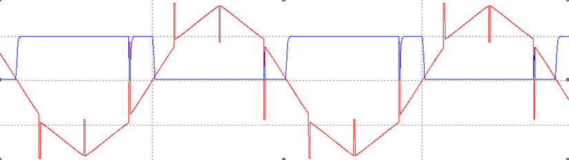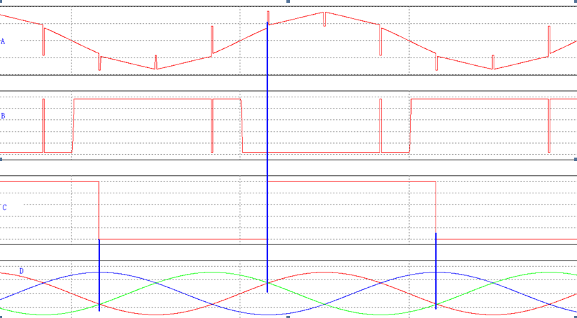 在這個(gè)電路中通過光耦TA、TB、TC的次級(jí)就可以獲取三相的過零信號(hào),但在反向整流工作中仍然由于電源缺口在光耦次級(jí)會(huì)有比較窄的過零脈沖,但是完全可以通過CPLD適當(dāng)?shù)奶幚砣サ簦鐖D3中的藍(lán)色,沒有經(jīng)過CPLD處理時(shí)獲取的信號(hào):