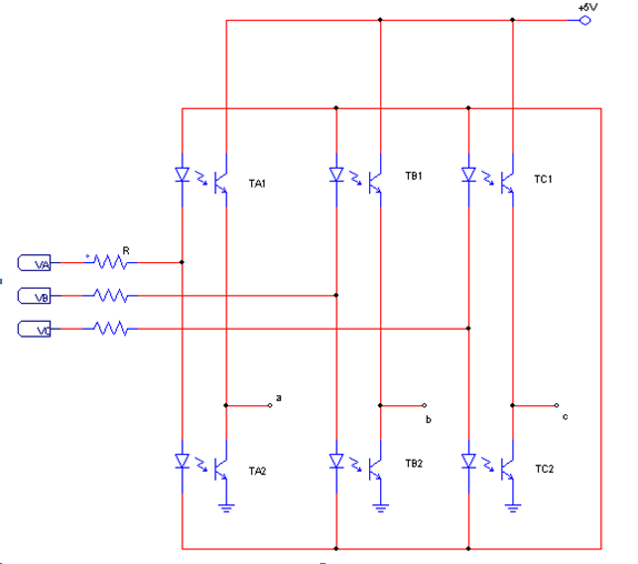 對(duì)于上述情況考慮采用光耦來(lái)獲取同步信號(hào)的過零點(diǎn),這樣就可以不用考慮三相中點(diǎn)電位問題,又能夠獲取相電壓的過零點(diǎn),初步方式如圖2所示: